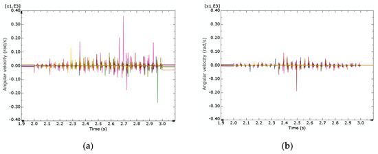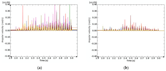 There are a variety of factors that can influence the compaction properties of asphalt mixtures, including grading, temperature, bitumen content, aggregate qualities, compaction procedures, and other variables [29]. In order to examine the influence of gradation on the compaction characteristics of asphalt mixtures, two kinds of asphalt mixtures, AC 11 and PA 11, both with a maximum particle size of 11.2 mm, were used in this study. Ten particles that would be impacted by the paver in step 2, described in the last section, were chosen. Their rotating motions during compaction were observed, and the angular velocities of their rotational axes in three directions were plotted in Figure 6, Figure 7, Figure 8 and Figure 9. In these figures, each curve representing the corresponding angular velocity of each particle is drawn in specific color.