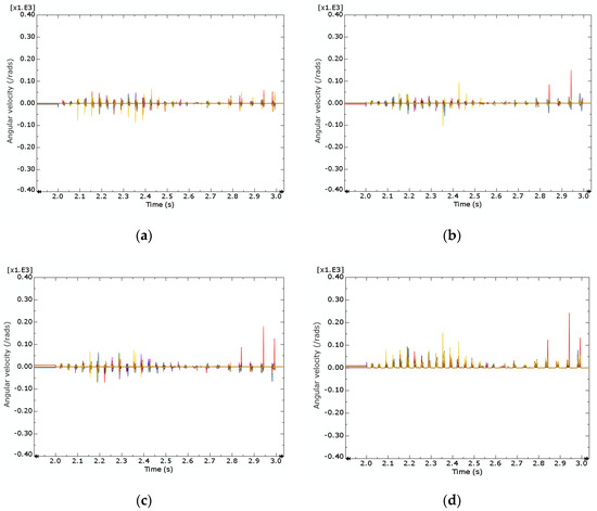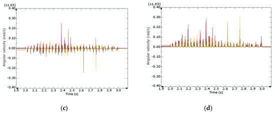 Angular velocity of AC 11 aggregate with a paving speed of 4 m/min: (a) in X-direction; (b) in Y-direction; (c) in Z-direction; (d) combined angular velocity.