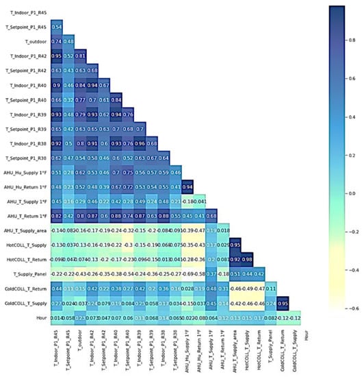 The dataset was also reduced in the number of its features, trying to keep only the variables that impact the target variable (i.e., indoor temperature). Even if a lot of features resulted to be linked to each other by a strong correlation, as shown in Figure 3, the correlation was not used as a driver in the choice of relevant features. The features were originally 63 and were selected through the expert judgement method. With the exception of the outside temperature, the selected characteristics concern the air-conditioning system related to the radiant ceiling panels located in the offices and the air-handling units connected to them; therefore, many of the original characteristics concerning the solar system or other parts of the air-conditioning system were discarded. Even if other variables (i.e., solar radiation) may have an impact on predicted variables, we chose not to further collect them, to enhance the model capability to provide accurate predictions using as less information as possible. Moreover, Attoue et al. [] illustrated that the neglect of some external variables (i.e., solar radiation, humidity and even the historical outdoor temperature) did not significantly deteriorate the performance of their ANN model, as the MSE increased from 0.0277 to 0.0365 while R decreased from 0.9967 to 0.9959. However, they reported that among cited external features, the outdoor temperature had the highest importance (i.e., importance factor of 42%). A similar finding was confirmed by Fang et al. [] whose correlation analysis outlined the future outdoor temperature as the most important exogenous variable, so we decided to keep it as an input. The main criterion adopted was selecting among available features only the ones that were related to the heating system which involved the target offices. Hence, these were considered valuable as input features variables associated with air-handling units and cold and hot collectors belonging to ceiling conditioning panels. In the end, it results in 49 features, which include outdoor temperature, indoor temperature for each office, set-point temperature for each office, ceiling panel supply temperature, supply and return temperatures of cold and warm collectors, supply and return air temperature for each floor, overall supply air temperature for the whole building area, supply and return a degree of humidity for each floor.