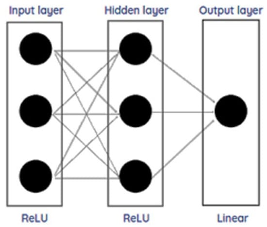 The indoor temperature prediction was achieved through a black-box model, more specifically, an LSTM neural network. According to several studies, such as by Huang et al. [], LSTM is likely to outperform other machine learning methods in terms of predicting a variable variation trend. They proved to be particularly suitable for time series prediction thanks to their ability to process the entire data sequences and not only single data points. The network is made of three separate layers; the activation function chosen for the input layer and the hidden layer is ReLU, thanks to its versatility, while the output layer is associated with a linear activation function. Moreover, the output layer contains several neurons equal to the number of the features that have to be predicted (i.e., one temperature for one office in the MISO approach and five temperatures, associated with each office on the whole floor in the MIMO approach). The batch size is set to 64. A simplified representation of the network architecture is reported below in Figure 5.