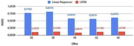 Comparison or RMSE achieved using linear regressor or LSTM neural networks by the office. The error is computed on the validation set only, for a 2 h time horizon.