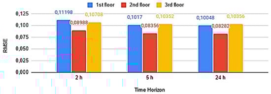 The models defined for each time horizon were tested on second- and third-floor data over all the available periods. The outcomes are reported in Figure 14.