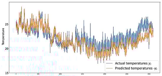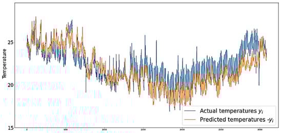 Xu et al. [] exploited the potential of LSTM for forecasting purposes and obtained an RMSE between 0.3 °C and 0.5 °C with two months of collected data and forecast horizons from 5 to 30 min. The results listed are generally in the same range in terms of error, bearing in mind that a fair comparison is rendered impossible by significant differences, for example, in the availability of training data, the forecast horizons chosen and the building areas. In conclusion, this result suggests that the proposed model provides satisfactory forecast accuracy for the periods considered. Consequently, optimised management of the controlled variables based on the forecasts obtained could support a valuable service and represent an advantage in terms of energy savings.
