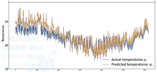 As mentioned in Section Materials and Methods, many input features are correlated with the predicted variable. The temperature of the return air from inside the building is the most correlated variable. An additional test was carried out on the model to explore if it can predict the return air temperature as input. Figure 13 confirms that the considered feature plays a significant role in the prediction since while it is missing the model performance slightly worsens, but that it is not essential, as errors are still under the acceptability threshold –0.15 °C.
