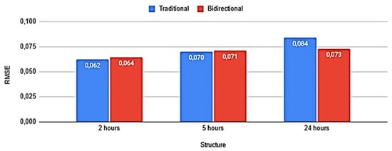 The bidirectional model structure was tested along with the traditional one, both paired with MSE function loss that resulted in the best one in the tuning so far. As shown in Figure 12, bidirectional structure performance is comparable with traditional structure ones, but it seems to be less affected by prediction horizon length. On the other hand, the bidirectional structure turns out to be less effective for the shortest prediction horizon considered.