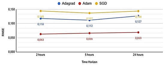 Among the optimisers tested, Adam systematically provides the best performance for shorter forecast horizons. However, this may no longer be true when it comes to longer time horizons because, unlike Adagrad and SGD, Adam’s performance deteriorates with longer periods, as shown in Figure 11. When it comes to the time parameter, it becomes immediately clear that it is one of the most performance-impacting variables. This is confirmed also by Attoue et al. [] that reported the same pattern, obtaining for the prediction horizon of 4 h an R = 0.8370 and MSE = 1.23783 versus an R = 0.9109 and MSE = 0.89078 for the 2 h forecasting. Fang et al. [], chose the Adam optimiser for their model because of its excellent performance in handling LSTM training dynamics and its rapid convergence speed, and tried to predict internal temperatures up to 7 days in advance, they observed a similar deterioration in prediction quality as time passed, especially after the first 48 h. Figure 11 shows that the Adam average RMSE continues to grow while enlarging the prediction time step so that a sort of turning point is reached and a change of optimiser is required to keep the average error around the reference value of 0.1 Celsius degrees. As mentioned before, in fact, Adagrad and especially SGD prove to better handle wider prediction time ranges. Therefore, for the longer forecast horizon, Adagrad is preferable.
