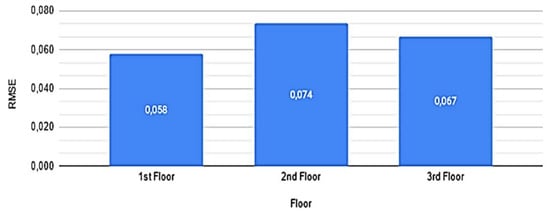 The tuning of the models trained on data from all three floors of the building is detailed. The parameter space chosen for the grid search ranges from 32 up to 256 neurons for the first layer and the hidden layer, including some arbitrarily chosen intermediate values. Tuning was performed using a model that includes a single hidden layer, together with the input and output layers. In fact, as Huang et al. [] also stated, an accurate ANN model does not necessarily have to be large, to the extent that oversized networks can lead to large prediction errors with high-frequency noise. Looking at the figures below (Figure 8), it becomes clear that the more complex is the model, the more it is likely to overfit instead of staying adaptable to differing datasets. The increase in the number of neurons in model layers worsens performances on unknown datasets, to the point that the 256 neurons model completely fails with the validation set. It follows that it is convenient to choose 128 as the best suitable number of neurons, as the error hits a local minimum in that area. The average RMSE in this instance results to be around 0.1, which was considered acceptable for two reasons: it is similar to several results achieved in literature studies that leverage comparable approaches or models. Moreover, this misprediction would go unnoticed by building occupants since the human body is not sensitive to change in terms of °C decimal.