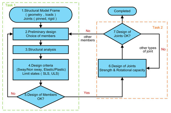 Figure 1 shows the workflow of the entire design. The main feature of this process is that in task 1, the engineers do not need to care about any joint details when selecting the member profiles, and only pass limited data to task 2. Initially, the joints are assumed to be either pinned or rigid. After the member design is completed, the engineers provide the joint designers with the end reactions of beams and the assumptions of joints.