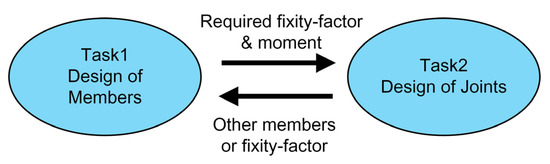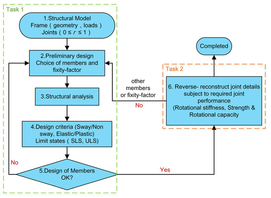 Here, a new design process suitable for semi-rigid steel frames is proposed, as shown in Figure 2. It can be seen that the new process is basically similar to the traditional one, except for some minor changes. In Task 1, there is no longer a need to focus on the types and details of the joints, but on their required performance. In Task 2, the joint design can be achieved by solving the inverse problem. The two tasks are linked together by the end fixity-factor and the required moment of the beam, as shown in Figure 3.