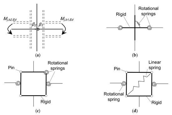As displayed in Figure 5, a joint consists of a web panel in shear and a connection, the joint model should be able to take into account the behavior of these two parts under loads. In EN1993-1-8 [23] the beam element with end rotational springs is recommended, see Figure 6a. To take into account the shear interaction in the web panel, a transformation parameter is defined, and its precise value needs an iterative process, which inevitably increases the computation efforts. Other approaches, as shown in Figure 6b–d, developed the macro four-node joint element [40] or modeled the joint explicitly [41,42,43], which can take into consideration the behavior of the connection, as well as the panel zone in a complete way without the use of . All internal forces and deformation that concur at the joint are considered automatically. Currently, the explicit ways can be implemented in modern structural software conveniently, thus, the scissor model is adopted in this study.
