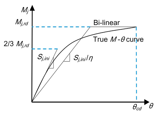 Although it would be correct to use a full joint moment–rotation curve in the structural model as the rotational characteristics of a semi-rigid joint are highly nonlinear, as shown in Figure 7, it is not convenient for engineering practice. Due to multiple parameters needing to be defined, more computing resources would be consumed. In practice, a simplified bi-linear model named the half initial secant stiffness method [44] can be used to approximate the moment-rotation characteristic of the joint.