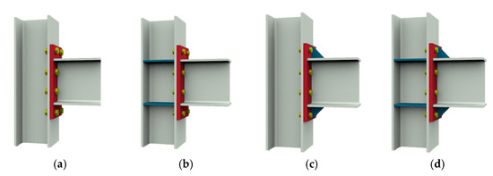 Available connection configurations for one pair of beam–column: (a) Neither continuity plates nor ribs; (b) Only continuity plates; (c) Only ribs; (d) Both stiffeners and ribs.