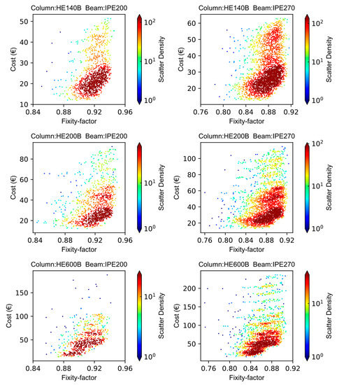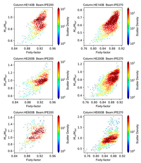 The scatter density diagrams of fixity-factor vs. moment capacity coefficient are shown in Figure 9. Each point represents available joint details. The color band in the figure is used to mark the density of samples. Red indicates a higher number of valid configurations, while blue indicates a lower number.