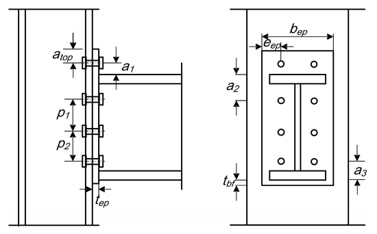 - GeometryThe joint geometry should meet the requirements of EN1998-1-8 [23]. These constraints are related to the bolt’s layout, including bolt diameter, edge distance, bolt spacing and assembly space.