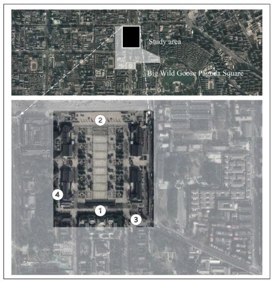 The Big Wild Goose Pagoda Square was built in 589 A.D. After more than 1000 years of rising and falling and expansion, it is an iconic square in Xi’an and was listed among the World Heritage Sites in 2013 []. This study was conducted in the Big Wild Goose Pagoda’s North Square (Figure 1). The Square is made up of a water fountain, a cultural square, a garden landscape, a cultural promenade and tourism commercial facilities, with the tower serving as the center axis. It measures 480 m east to west and 350 m north to south and covers 168,000 m2.