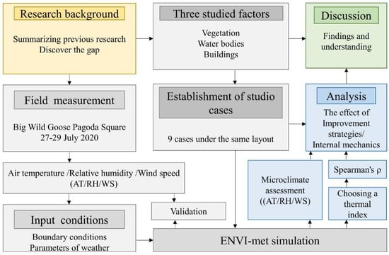 Xi’an has four distinct seasons, with the hottest month of July and the coldest month of January throughout the year. In this study, field measurements were performed in the Big Wild Goose Pagoda’s North Square from 27–29 July 2020. Four measurement sites were set up at the north–south road, entrance square, east–west road and green space for this study to investigate the various influencing elements (Figure 1). Site 2 was used as a reference site because it is the closest to the boundary without the influence of shade all day. All instruments were ISO 7726 compliant and were mounted on tripods in the square at a height of 1.4 m above ground. Detailed information on the instruments is in Table 2. In addition to the measured climatic parameters, data from local weather stations were consulted. These observations were utilized to determine the microclimate conditions in the study area and served as the foundation for the square simulation model. Figure 2 shows the framework for this study.