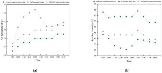 Previous studies have emphasized that changing boundary settings, material properties and experimental protocols can improve the correlation between simulations and measurements [,]. In this study, the weather station was located on the outskirts of Xi’an city, far from the measurement site in the city center. To reduce the error between the simulation and measurements, the input meteorological parameters of the model needed to be modified, and the modified data were used as the original boundary condition of modeling. Upon completion of the data collection, we compared the measurements from the reference station with the data from the weather station. As shown in Figure 3a,b, the measured temperature per hour at the weather station was 1–4.5 °C below the measured data, and the RH was 3–30% percent higher than the measured data. Therefore, in this study, modified weather station data that increased the AT of the weather station by 7% and decreased the RH by 20% were used as the input data for the model. Table 3 shows the microclimate simulation settings and meteorological parameters that were entered by the model in ENVI-met.