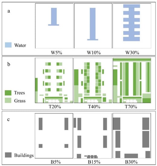 The current coverage of water bodies, vegetation and buildings in the study area is 10%, 20% and 15%, respectively. Previous studies have concluded that people prefer to be exposed to green spaces with water []. According to the characteristics of the cultural theme square, more than 80% of these spaces are designed with water bodies. The average proportion of water area ranges from 5% to 25%, with a minimum of about 5% and a maximum of about 30% []. On this basis, the water coverage in the model was redesigned to 5% and 30% to compare with the current coverage of the study area (10%). These cases are symbolized by W5%, W10% and W30%, as shown in Figure 4a. Greenspace has been identified as an important factor influencing the landscape preference of the square []. According to the Chinese urban green space classification standard, the percentage of the green area is classified as less than 35%, 35% to 65% and greater than 65% []. Based on this criterion, the model was redesigned to 40% and 70% for comparison with the status quo (20%). These cases are symbolized by T20%, T40% and T70%, as shown in Figure 4b. Previous studies have proven that building thermal comfort for the whole day outdoors is mainly affected by building height, and building distance and layout form have negligible effects on the average outdoor thermal comfort of spaces [,]. Buildings in the study area are currently predominantly two-story, with some single-story structures and a building coverage of 15%. Considering the influence of building coverage and height on the thermal environment of the site, the building coverage was redesigned to 5% and 30% to compare with the current situation (15%). These cases are symbolized by B5%, B15% and B30%, as illustrated in Figure 4c.