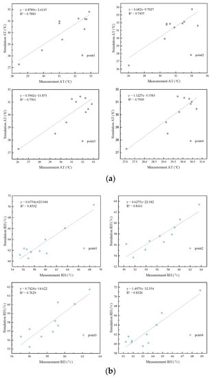 In this study, a statistical analysis of the simulation and measurement data was performed using the Statistical Package for the Social Sciences (SPSS). As previous studies have proposed, AT and relative humidity RH have been used to test ENVI-met models as important microclimate parameters [,]. Therefore, the ENVI-met model was validated using AT and RH measurements from the four sites. The results are considered more accurate when the root-mean-square deviation (RMSE) values approach zero and when R2 values approach one. Figure 5 shows a comparison between the simulated model and the field data. It was calculated that the RMSE in AT was 0.92 °C and that the RMSE in RH was 1.061. In the ENVI-met model of simple force, the measurement deviated from the simulation, which may be attributed to the static cloud and wind condition assumptions. In addition, inadequate measurements of air flow [], wall and roof material properties and the use of default modeling were also contributing factors. Nevertheless, the RSME values that were obtained in the current study are in the range of those summarized by Salata et al. in a recent review of ENVI-met simulations (RMSE in AT is less than 4.30 °C, and RMSE in RH is less than 10.2) []. In addition, as shown in Figure 5a,b, the R2 in AT and RH were 0.79 and 0.86, indicating a high correlation between the measured and simulated values. The above data analysis shows that ENVI-met can be applied to the microclimate simulation of Xi’an urban squares.