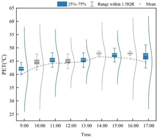 The PET values were calculated for the research area by Biomet. As previous studies have proposed, the worst thermal comfort conditions always occur between 14:00 and 16:00 [,,], both in real measurements and in ENVI-met modeling. Figure 6 shows the PET values for the north square of the Big Wild Goose Pagoda from 9:00 to 18:00. Since the distribution of PETs within each hour does not satisfy a normal distribution, the mean of this data set is more representative than the median. The line of the means shows that the mean PET values in the study area were the highest at 14:00, reaching “very hot” (PET > 46 °C) in summer. Therefore, this section focuses on the microclimate and thermal comfort of the square at 12:00.