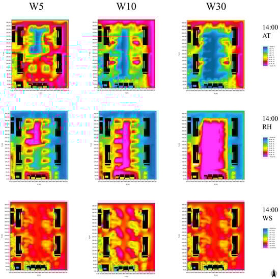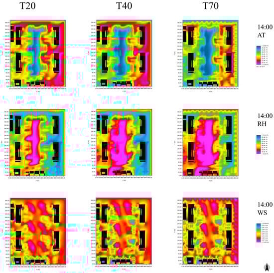 Distribution maps of microclimate parameters at 14:00 with redesigned vegetation coverage.