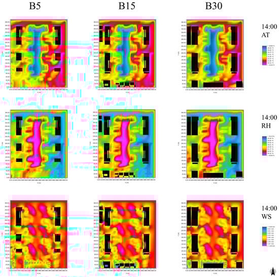 With respect to relative humidity, a comparison of the three cases reveals that the changes in building height and density caused only slight changes in the RH distribution within the square. With respect to wind speed, past studies have shown that increasing building height and density decreases the overall wind speed. In this study, B30% was the case with the largest building coverage and height. In the summer, the wind speed distribution of B30% was lower than it was in the other two cases. The increase in buildings increased the wind shadow area in the vicinity, which led to a decrease in WS in the wind shadow area.