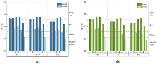 Since sites 2 and 4 are more representative, the PET values were calculated and compared between 9:00 and 18:00 for sites 2 and 4 after the square redesign (Figure 10). Figure 6 shows that the thermal comfort of the study area in summer is classified as “very hot” after 12:00. The PET values in the redesigned square did not decrease significantly, but the human comfort was reduced from “very hot” to “hot”. This indicates that the redesign of the square had a moderating effect on thermal comfort. For instance, as shown in Figure 10, rising vegetation coverage usually improves thermal comfort in summer.