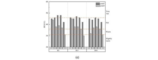 In the 55th ASHRAE Standard, human thermal comfort is clearly defined as a psychological state of satisfaction with the thermal environment []. The relationship between physiological factors and outdoor thermal comfort begins with heat exchange between the body and its surroundings. In normal times, people can dissipate heat by evaporation, convection and heat transfer to maintain heat balance with their surroundings []. This thermoregulatory activity can change the physiological parameters of the body accordingly. Therefore, given the correlation between physiological parameters and thermal comfort, although human thermal comfort is a subjective feeling, the relevant physiological parameters can be used as an objective evaluation indicator of human thermal comfort []. Dozens of thermal comfort evaluation criteria can be used for reference by researchers, including many thermal comfort evaluation criteria based on the steady-state heat transfer model and dynamic heat transfer model [,]. Over the last two decades, thermal comfort research has moved toward more complex dynamic conditions []. Thermal comfort prediction methods can be divided into three categories: (1) thermal equilibrium methods (mainly laboratory studies); (2) adaptive regression models (mainly field studies); and (3) adaptive heat balance [].