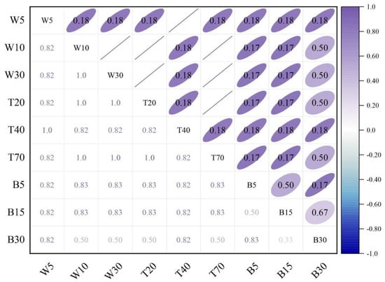 Spearman’s ρ is a parentless measure of two-variable dependence that uses a monotonic equation to evaluate the correlation between them. If the data do not contain any repeated values and the two variables are exactly monotonically connected, the Spearman’s ρ is either +1 or −1. Spearman’s ρ uses the rank order magnitude of the two variables for analysis and is a nonparametric statistical method []. It applies to continuous variables that do not meet the requirements of a normal distribution of Pearson correlation coefficients. It can also be used to measure the correlation between ordered categorical variables.