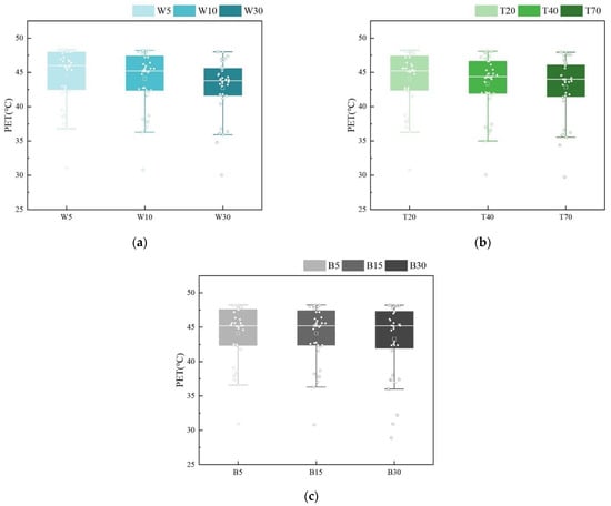 Box plots of PET from 9:00 to 18:00 vs. different quantities of (a) water bodies; (b) vegetation; and (c) buildings.