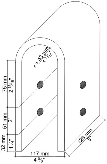 Figure 6 shows the final selected shape (NS5) including the full-size dimensions of the plate. The NS5 connector is designated as multiple yield zone (MYZ) connector in subsequent discussions. In field applications, one plate would be welded to each side of the shear wall (i.e., two identical ½ in or 12.7 mm plates at each connection). The vertical line on either side of the plate (in Figure 6) would be welded to flat steel plates that would be embedded in the concrete shear walls. It should be noted that the weld lines are straight, except for a small area at each end where the weld is extended into the curved zone for a short distance of 1 1/8 in (28.5 mm) as shown in Figure 6. The finite element analyses indicated that extending the weld area to include some of the upper and lower curved edges would improve the inelastic strain response.