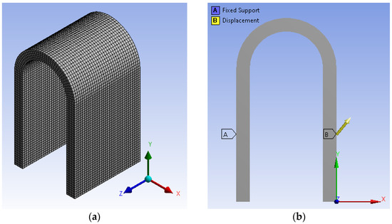 Finite elements model in ANSYS workbench: (a) meshed shape; (b) boundary condition.