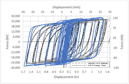 Finite element force-displacement response of 2/3-scale UFP connector: comparison of UFP experimental (solid blue line) and FEM (dashed black line) responses.