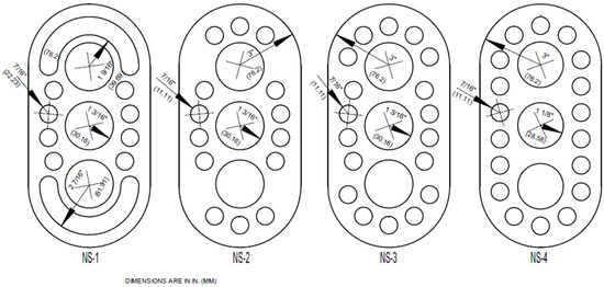 Based on an observed early low-cycle fatigue failure in an initial scaled test [12], it was decided that increasing the number of circular openings within the shape could assist with reducing the localized high plastic strains and improving the chance of the connector functioning (at reduced capacity) even with an initial low-cycle fatigue crack. The set of shapes examined consisted of a single plate with a thickness of 1 in (25.4 mm) and several larger and smaller cut-out circles. Geometric symmetry was maintained about the vertical and horizontal axes. Figure 5 shows the evolution of the last set of new shape designs that were examined (designated NS1 through NS4). Each shape was analyzed and examined for the reaction force developed and inelastic strain peaks in hot spots under cyclic displacements.