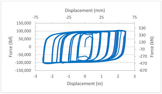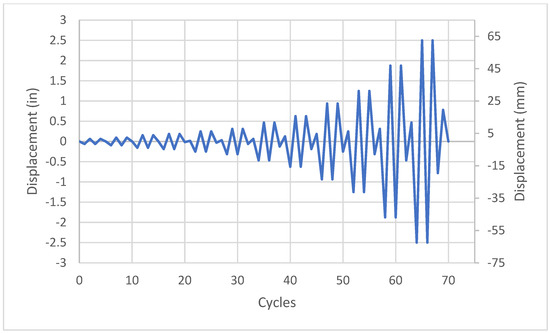 In the nonlinear FEM analyses of the MYZ plate (in ABAQUS), the 3-D solid element (C3D8R) was used to model the steel plate. A mesh size of 1/8 in (3.2 mm) was used, which resulted in a total of 15,701 elements as shown in Figure 7a. A mild, low carbon non-linear elastoplastic steel material model (representing ASTM A36 steel) with a yield strength of 36 ksi (250 MPa) was used. Figure 7b shows the boundary conditions for the MYZ plate representing welded attachments. One side was fixed along the weld lines, while the opposite side was subjected to a uniform displacement along the weld line. The imposed displacement amplitudes were adopted from the PRESSS program and adjusted for a full-scale model (shown in Figure 8).