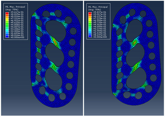 Maximum principal plastic strains for upward 2.5 in (64 mm) displacement (right) and downward 2.5 in (64 mm) displacement (left) for the MYZ shape.