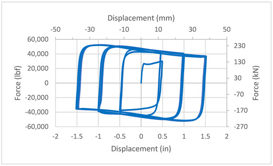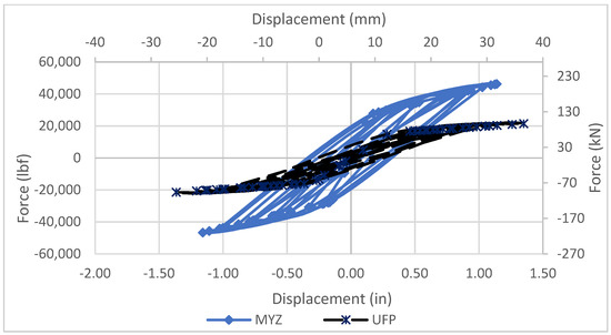 Figure 19 shows the force vs displacement relationship for the UFP and MYZ springs at the connector located at the top of the shear wall (highest expected displacement). The maximum displacement for this UFP connector was on the order of ±1.4 in. (35.6 mm) and the maximum force was approximately 21,500 lbf (95.6 kN). For the MYZ connector, the maximum displacement was approximately 1.2 in (30.5 mm) and the maximum force was on the order of 46,700 lbf (207.7 kN). The UFP connector had higher displacement and lower reaction force (connector force) than the MYZ connector. More importantly, the MYZ connector dissipated significantly higher energy (area under the load-displacement curve) than the UFP connector.