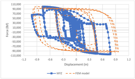 Load-displacement results—scaled-up experimental results vs FEM for MYZ-1 Specimen.