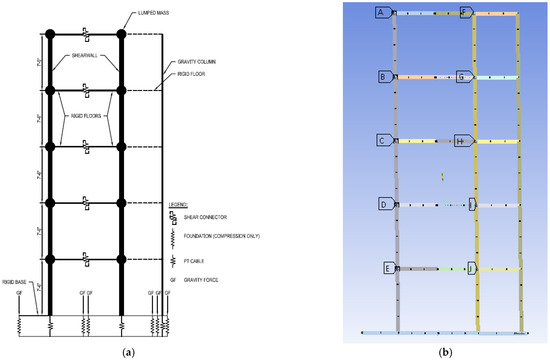 ANSYS building model: (a) concept model, (b) Ansys presentation (lumped masses are designated A through J).
