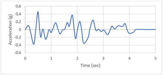 A simplified FEM model of a shear wall building was needed to confirm and compare the responses of the new MYZ device with the conventional UFP connector. Sritharan et al. [14] developed a simplified frame model to represent a 60% scaled shear wall building model used in the PRESSS program (Figure 15). In this study, the ANSYS finite element software was used to recreate the same 60% scale building model with the same member properties. Lumped masses were added at the nodes (labeled A through J) as shown in Figure 15b. In addition to the two wall panels, the gravity columns in the building were also modeled as shown in Figure 15. The base springs (compression only) were defined as a “Body to Ground” type of spring with properties taken from Sritharan et al. [14]. ANSYS spring elements for the PT tendons were also based on the properties used by Sritharan et al. [14]. The model was subjected to base excitation with a ground acceleration history shown in Figure 16.