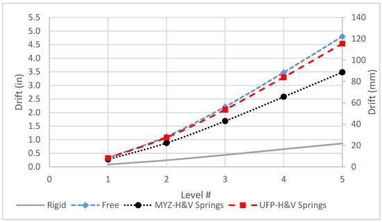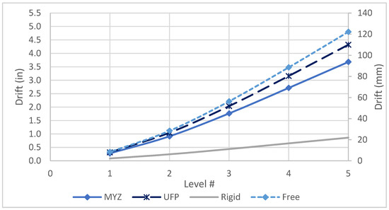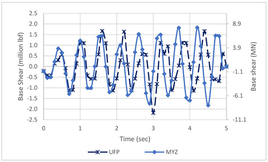 Figure 21 exhibits the base shear for the scaled building models with UFP and MYZ connectors. The maximum total base shear for building with UFP and MYZ connectors were 1834 kips (8158 kN) and 2175 kips (9675 kN), respectively. The higher stiffness of the MYZ device increased the total base shear when compared with the UFP connector. The base shears for the rigid and free connectors were 2.7 × 105 kips (1.2 × 106 kN) and 1085 kips (4.83 kN), respectively. The significantly higher base shear for the rigid model would mask other curves and it is therefore not shown in Figure 21. The building model with the MYZ connector developed slightly higher base shear when compared with the UFP model.