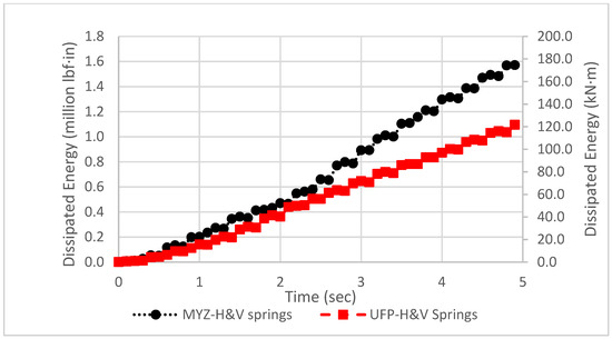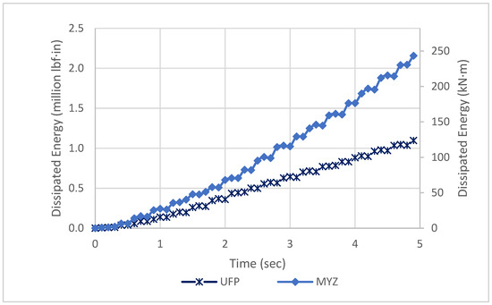 Cumulative dissipated energy for building models with UFP and MYZ connectors.