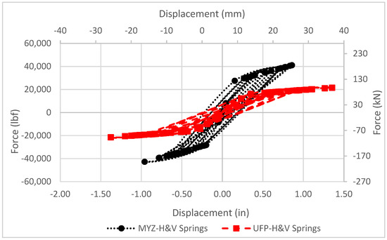 Vertical force vs vertical displacement responses for single UFP and MYZ connectors located in the building model with horizontal and vertical springs.