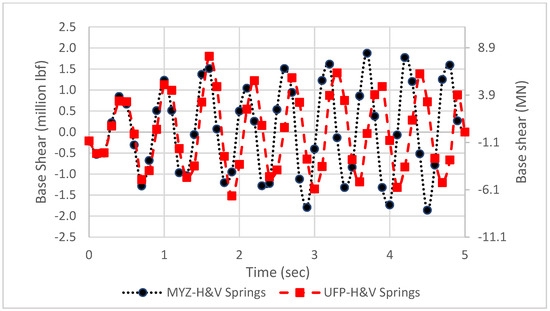Base shear for MYZ and UFP connectors in building models with horizontal and vertical springs.