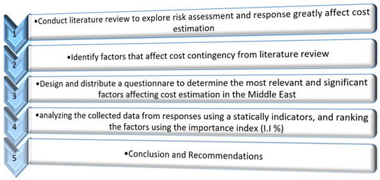 In order to identify the risk factors affecting construction projects in the Middle East, this paper started by conducting a literature review analysis to identify risk factors that might affect the cost of construction projects. The next step was to prepare and develop a questionnaire and distribute it to construction experts. The collected data from experts’ responses was analyzed using statistical indicators to prioritize the factors through the importance index (I.I%). Then, we conducted a risk assessment and determined the proper contingency to cover those uncertainties and minimize the project’s cost overrun. Figure 1 shows the flow chart of the methodology applied in this research.