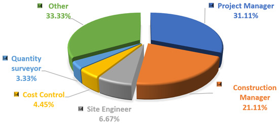 A pilot survey has been conducted to ensure the efficiency and clarity of the proposed questionnaire and improve it [52,53,54]. Ninety responses have been received from an extensive range of construction professionals in the industry, including site engineers, construction managers, project control managers, project managers, quantity surveyors, technical managers, cost engineers, and contracts managers as shown in Figure 2.