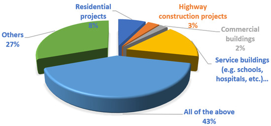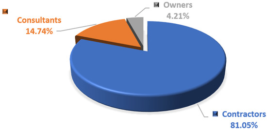 Data was collected from different 25 construction projects located in the Middle East (Egypt, KSA, UAE, Qatar, Jordan, Palestine, Bahrain, Kuwait, and Iraq). Figure 3 shows the percentage of different project types surveyed. One hundred questionnaires were distributed to professionals in the construction industry to get their opinions about the risks that might affect the construction projects’ cost estimation. Ninety questionnaires were completed with a participation rate of 90%. The respondents were classified into four categories depending on the job position, their experiences, type of organization, and the type of projects they completed. As shown in Figure 4, contractors represent 81.05%, consultants 14.74%, and owners’ participation rate was 4.21%, which is low since consultants also represent the owners.
