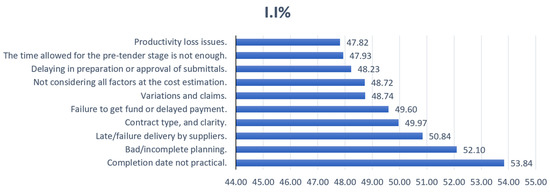Figure 5 shows the top ten critical factors among 51 factors according to I.I% that may affect the projects’ cost estimation in the Middle East. All ten factors have I.I% above 45%. The most critical factor is “the completion date not practical” with 53.84%, and the last one is “productivity loss issues” with 47.82%.