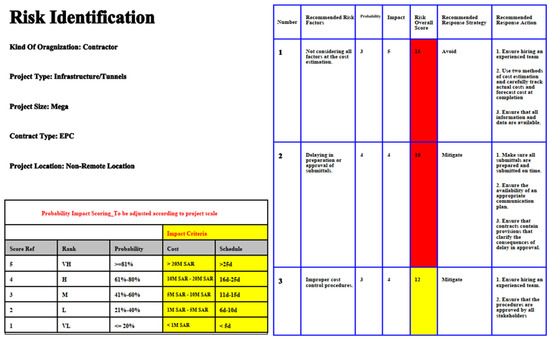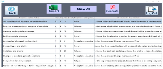 Figure 8 shows the generated report, which provides 125 recommended risk factors including probability, impact, and risk score, as well as the recommended response strategy and response action for each risk following the result of this paper and experts’ judgment depending on our inputs. Only selected factors from the report are discussed due to paper length restrictions. The 1st risk factor was not considering all factors at the cost estimation, which is one of the top ten in this paper with a 15 risk score; as the risk score for this risk is high, it is recommended to avoid it by ensuring the hiring of an experienced team, using two cost estimation methods, and ensure that all information and data are available.