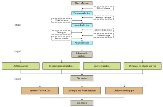 Due to the interdisciplinary nature of CM, a comprehensive academic database, Web of Science, known for its comprehensiveness, organizational structure, and scientific robustness, was chosen in this study []. It is a consensus in the industry that articles in high-ranking journals usually have high influence []. Considering this fact, the authors selected the journals that have an important impact and top quality in CM based on the 2019 Scopus journal metrics (CiteScore is not less than 2) and the ranking of CM journals []. Moreover, in view of timeliness, these journals must have published at least three papers related to ANN in CM between 2000 and 2020.